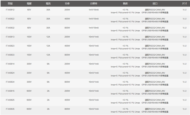 電源/負載一鍵切換 IT-M3600很好的將兩種設備集合在了½U的小巧體積中,不僅可以當高性能的雙向直流電源運行;也可以當回饋載操作,模擬各種負載特性,並將電能無污染的回饋電網,一機多用。用戶無需通過軟件以及任何終端設備,一鍵即可切換操作模式,避免了在連接設備及操作軟件時花費過多時間,同時也大大的節省了空間和成本。 ½ U Mini體積 IT-M3600擁有½U的Mini體積,可提供800W功率輸出,不但具備高功率密度,同時也擁有高分辨率、高精度和高穩定性等特性。輸出電壓可達600V,輸出電流可達30A。全系列共有12個型號,寬範圍輸出設計,一台機器可涵蓋廣範圍的應用需求。 電源/負載無縫切換 不同於傳統的電源和負載在正負電流切換時,中間會存在短暫的跳變和不連貫現象。IT-M3600將雙向電源和回饋式負載功能特性集於一體,能夠實現高速的源和載電流模式轉換,從而在輸出和吸收電流之間進行快速連續的無縫切換,有效避免電壓或電流過沖,廣泛適用於電池、電池封裝以及電池保護闆等儲能設備測試。